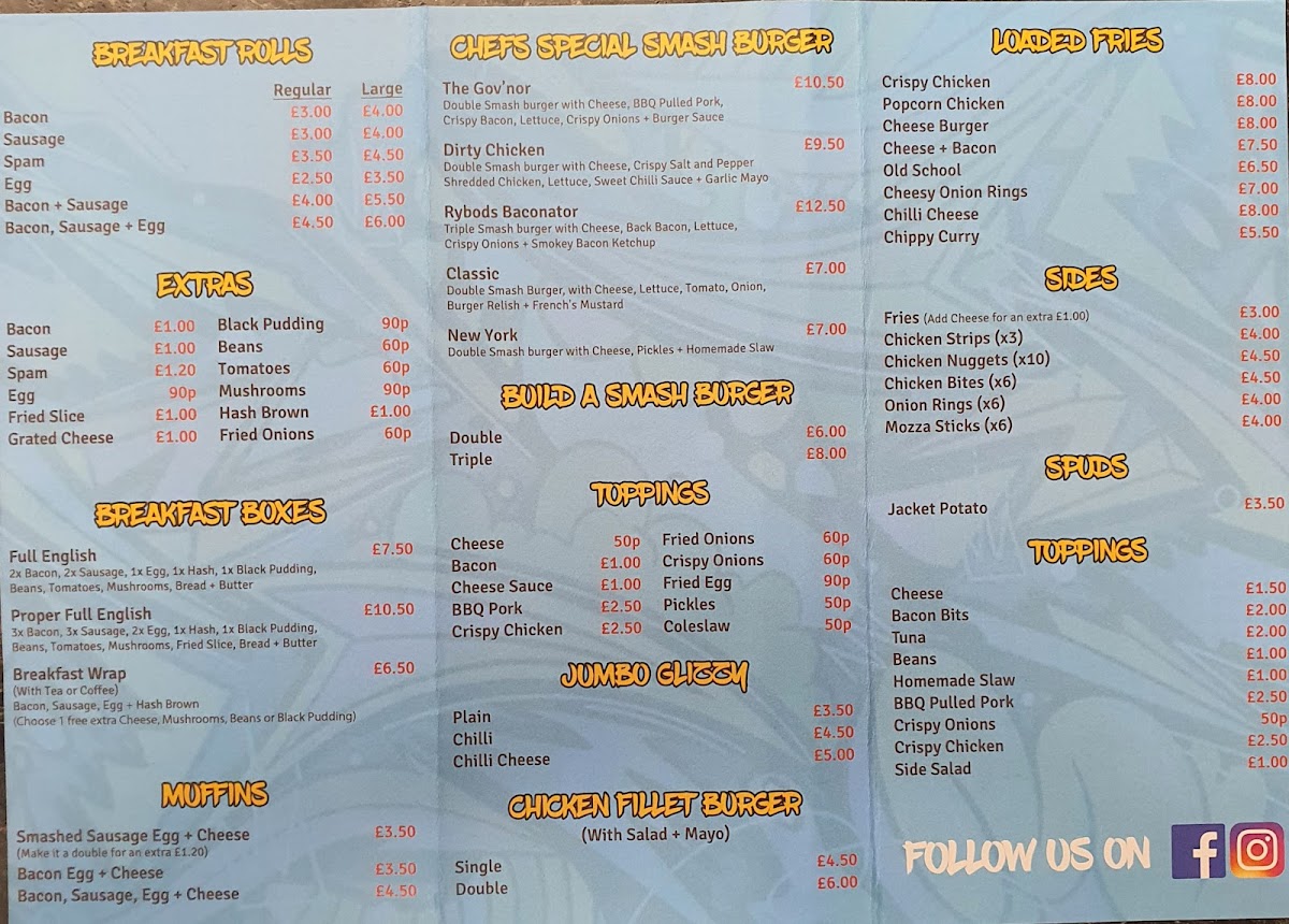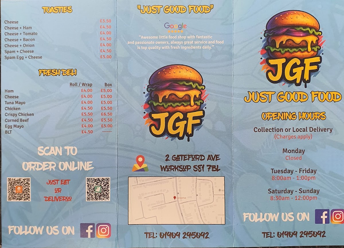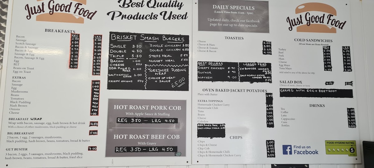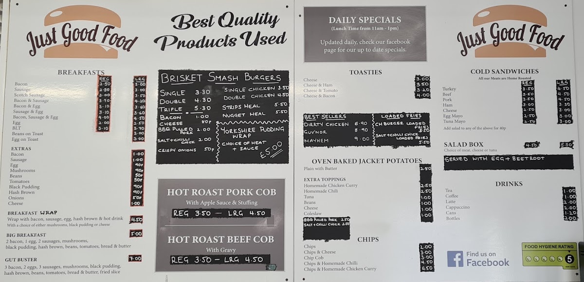 From a reviewer’s perspective, the menu at Just Good Food offers a wide and satisfying selection that covers everything from hearty breakfasts to indulgent comfort food. The breakfast range is particularly strong, featuring options like Bacon, Sausage, Scotch Sausage, Bacon & Sausage, and Bacon & Egg, along with larger choices such as the Big Breakfast and the Gut Buster. For lunch and dinner, popular items like the Dirrty Chicken and Mayhem stand out among the best sellers, while the Chefs Special Smash Burger selection includes impressive options like The Gov'nor, Dirty Chicken, Rybods Baconator, Classic, and New York. The menu also offers comforting sides and casual favourites such as Chips, Chips & Cheese, Chips & Homemade Chilli, and Chips & Homemade Chicken Curry, plus lighter options like deli sandwiches including Turkey, Beef, Pork, Ham, and Cheese. There are also plenty of indulgent extras like Loaded Fries with choices such as Crispy Chicken, Popcorn Chicken, and Cheese Burger, as well as desserts like Cheesecake Of The Day, Flapjack, and Chocolate Concrete. Overall, the menu is varied, filling, and focused on classic British comfort food, making it a great choice for anyone looking for generous portions and familiar favourites.