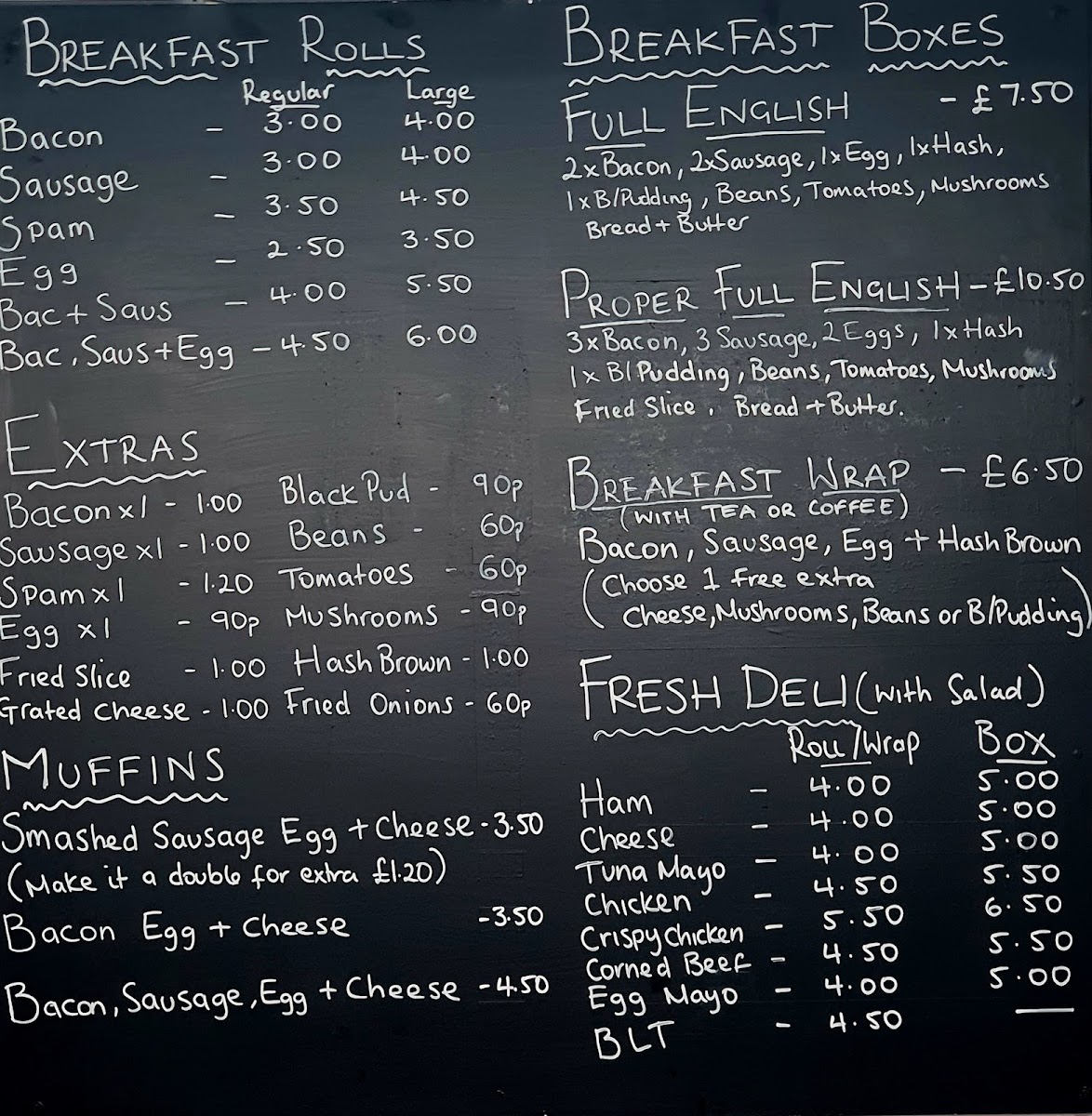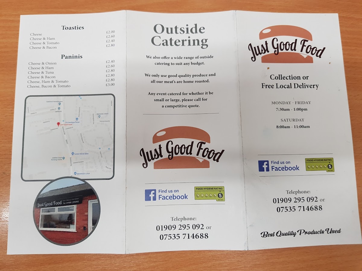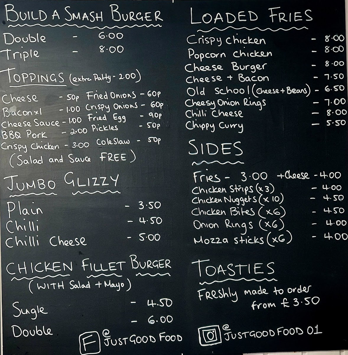 From a reviewer’s perspective, the menu at Just Good Food offers a wide and satisfying selection that covers everything from hearty breakfasts to indulgent comfort food. The breakfast range is particularly strong, featuring options like Bacon, Sausage, Scotch Sausage, Bacon & Sausage, and Bacon & Egg, along with larger choices such as the Big Breakfast and the Gut Buster. For lunch and dinner, popular items like the Dirrty Chicken and Mayhem stand out among the best sellers, while the Chefs Special Smash Burger selection includes impressive options like The Gov'nor, Dirty Chicken, Rybods Baconator, Classic, and New York. The menu also offers comforting sides and casual favourites such as Chips, Chips & Cheese, Chips & Homemade Chilli, and Chips & Homemade Chicken Curry, plus lighter options like deli sandwiches including Turkey, Beef, Pork, Ham, and Cheese. There are also plenty of indulgent extras like Loaded Fries with choices such as Crispy Chicken, Popcorn Chicken, and Cheese Burger, as well as desserts like Cheesecake Of The Day, Flapjack, and Chocolate Concrete. Overall, the menu is varied, filling, and focused on classic British comfort food, making it a great choice for anyone looking for generous portions and familiar favourites.